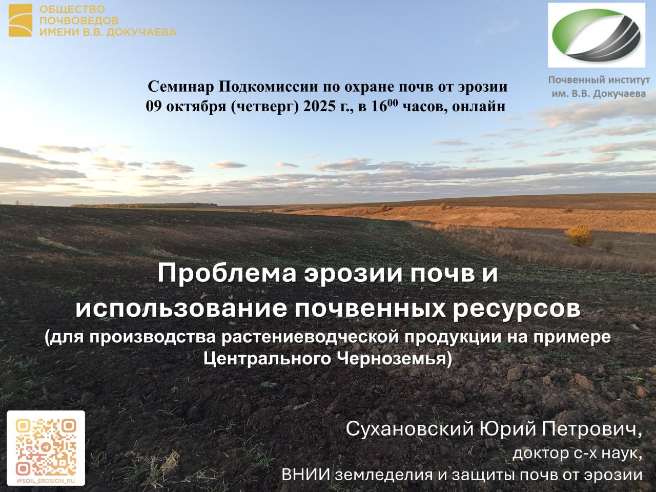 9 октября (четверг) состоится семинар, организованный Подкомиссией по охране почв от эрозии Общества почвоведов им. В.В. Докучаева. В рамках мероприятия будет представлен доклад доктора сельскохозяйственных наук, доклад Сухановского Юрия Петровича